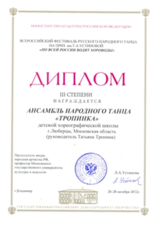 Тропина Татьяна Ивановна | Преподаватель | Высшее, Кемеровский Государственный институт культуры, руководитель хореографического коллектива, Московский государственный университет им. Шолохова, преподаватель дошкольного образования | 41 | Высшая | 18.03.2009 | 18.03.2014 | |