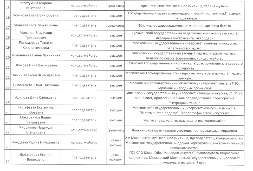 Жуков Юрий Александрович | Концертмейстер | Высшее, Коломенский педагогический институт, учитель | 29 | Первая | 01.03.2009 | 01.03.2014 | |