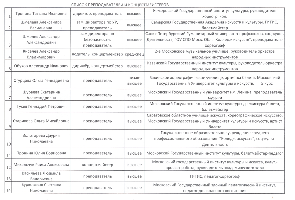 Гусева Валентина Васильевна | Преподаватель | Высшее, Российская академия театрального искусства, балетмейстер | 40 | Высшая | 28.04.2010 | 28.04.2015 | |